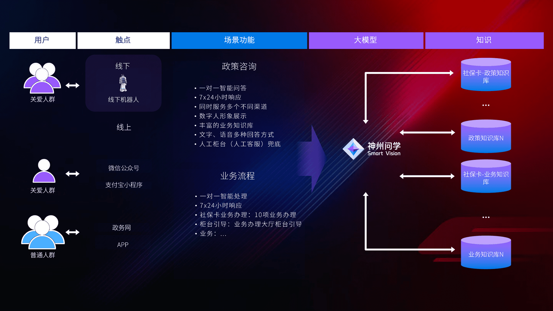 • 利用大语言模型+RAG技术,,,,支持多轮对话,,,可识别多种同义词、、、近义词,,,精准理解关爱人群语义快速输出结果。。