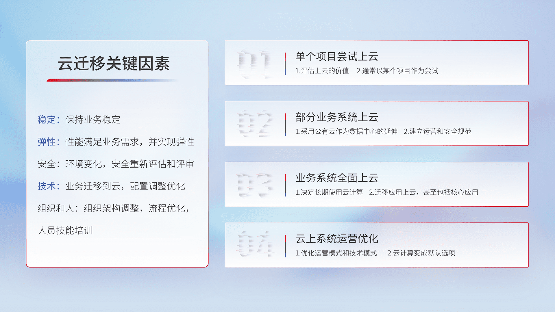 结合实际业务,,,从规划设计、、、云平台选型、、、云原生改造、、、数据迁移、、集成交付,,,,迁移全过程为客户识别最佳上云路径,,,,做好风险识别管理,,,设计网络架构、、、、身份权限、、安全审计合规、、、操作审计、、日志审计、、监控告警策略、、、、多站点容灾设计等,,对云上基础设施进行整体规划,,提升IT治理水平,,,以满足弹性、、高可用、、、、高性能的需求。。。。