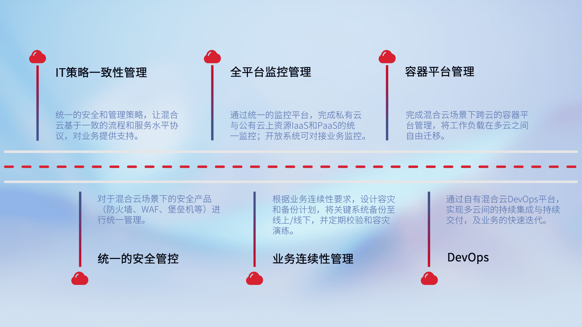 通过多云纳管,,,以统一的资源数据模型把客户的云资源进行抽象和封装,,进而实现对多云资源的统一操作,,,,保障云资源管理的可靠性、、、、稳定性与可用性。。量身定制化运维内容,,,配置、、开发运维、、、、补丁管理、、、备份、、监控、、、认证和访问管理、、审计和日常巡检等,,,,保障在用云过程中的可靠度,,,稳定度以及高可用率。。。